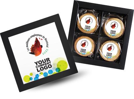Choose 1-2 flavours of our delicious shortbread, baked fresh to order in a local family-owned bakery. Includes a black gift box with a custom lid insert, and 4 stacks of 3 cookies, each individually cello wrapped with a full colour label on top.