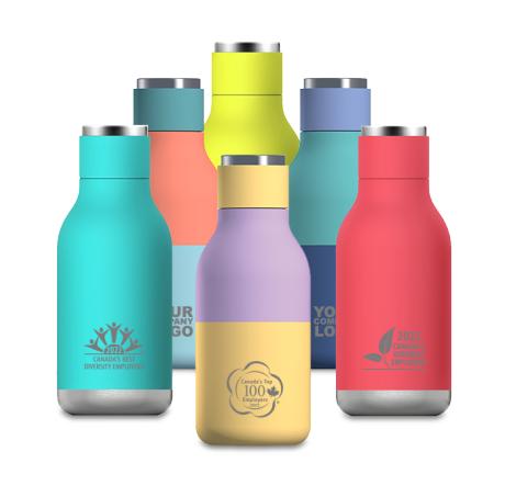 The Urban bottle is vacuum insulated double wall stainless steel which will stay cool up to 24 hours! The leak proof lid and easy grip texture make it a practical travel companion.
