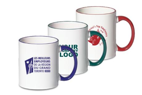 The classic timeless white ceramic mug is accented with colourful glazed handles and rims.