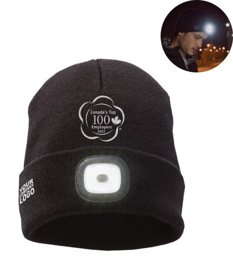 A thick rib knit toque with crown darts for a shaped fit, featuring a removable LED headlight. The headlight has three brightness settings, and pops out of the turn-back cuff for washing. A great knit toque for corporate, team and school apparel. The LED Knit Toque definitely gets your attention. Can be charged with a USB cable.