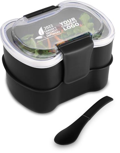 This two-tier bento box features two containers that snap together making food on the go a cinch. The containers are microwave safe enabling you to bring hot and cold food options for a complete meal.