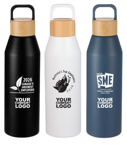 The Aspen Recycled Aluminum Bottle combines sustainability and style, crafted from 100% post-consumer recycled aluminum. Its durable design includes a leak-proof, screw-on FSC® certified bamboo lid with an integrated loop for convenient on-the-go hydration. The wide opening allows for easy filling with ice cubes and simplifies cleaning and refilling.