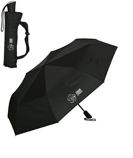 Eight panel umbrella auto open and close function at the push of a button. Hook and loop fastener tie closure. Black metal shaft with windproof function. Matching coloured rubberized comfort handle with wrist strap. Matching coloured self-material carry pouch. Carry pouch has handles with drawstring toggle closure.