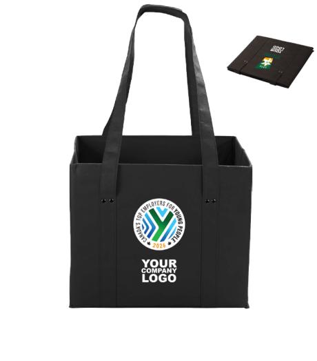 Non-woven material with supportive board reinforced on all sides, including sewn-in bottom board. This tote can completely collapse flat for easy storage when not in use. 12 and 1 half inches (or equivalently 31.75 centimeters) grab handles. Perfect for long-lasting use as a grocery tote or storage bin.