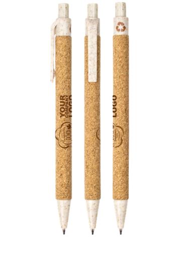 The barrel of this eco-friendly Cork ballpoint pen is made from 80% natural cork and 20% paper while the remaining base pen materials are made with 30% recycled wheat husk. The cork barrel provides a pleasing soft grip with a SureWrite™ low lead refill, allowing for a comfortable and smooth writing experience.