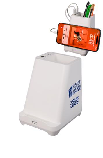The desk mate includes all of your desktop essentials: Bluetooth® Speaker, Stand, Charging Hub, and pen holder. The Bluetooth® speaker will provide over three hours of playback time at max volume. The built in microphone allows the desk mate to be used for conference calls without holding your phone. Includes type-C charging cable.