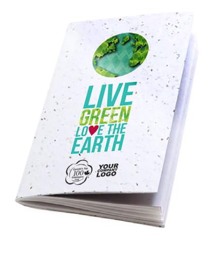 This pocket notebook features a plantable seed paper cover and includes 56 lined pages printed on 100% post-consumer paper. When finished with the notebook, recipients can plant the cover to grow a pot of beautiful wildflowers. Cover includes stock message and your custom logos.