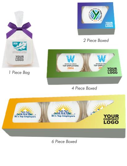 Custom logo-branded round shortbread cookies. Available in four different gift packs.