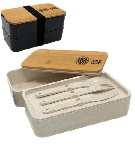 Made from sustainable and biodegradable wheat straw, mixed with PP for durability. Bamboo lid. Includes a set of wheat straw utensils. Two stackable compartments keep food separate. Microwave and freezer safe.